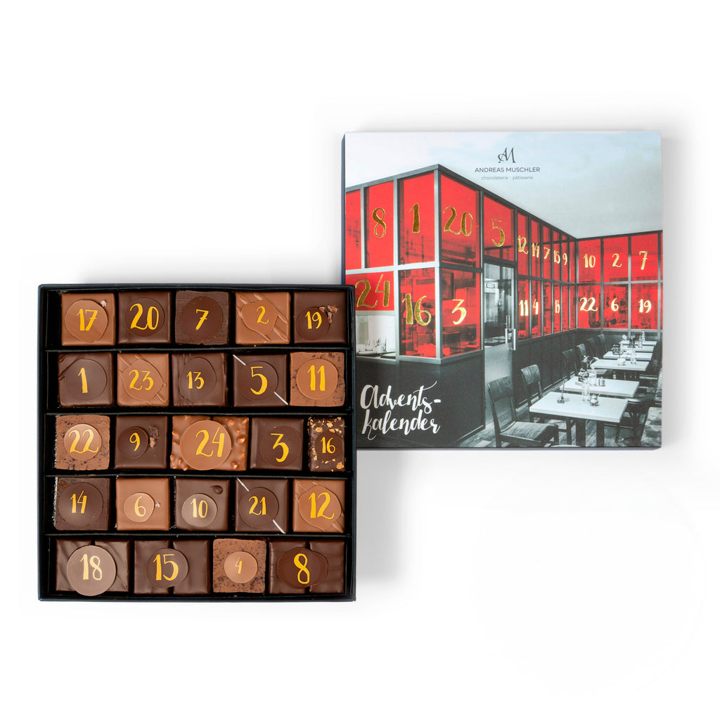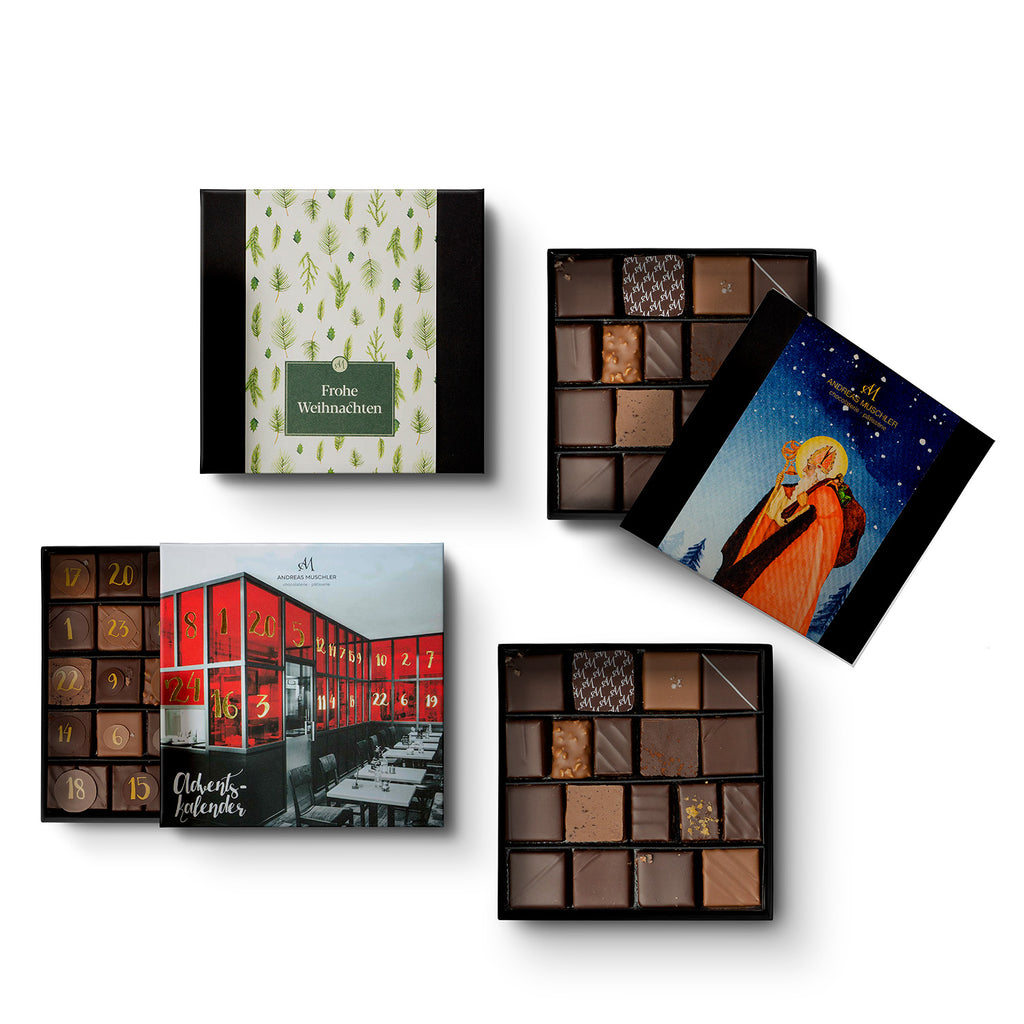 24 Genussmomente - 3 x doppelter Nougatgenuss - also eine Box voll mit 28 handgefertiger Pralinen versüßen das Warten auf Weihnachten. Davon wurden 13 Pralinen bei den »International Chocolate Awards« ausgezeichnet.